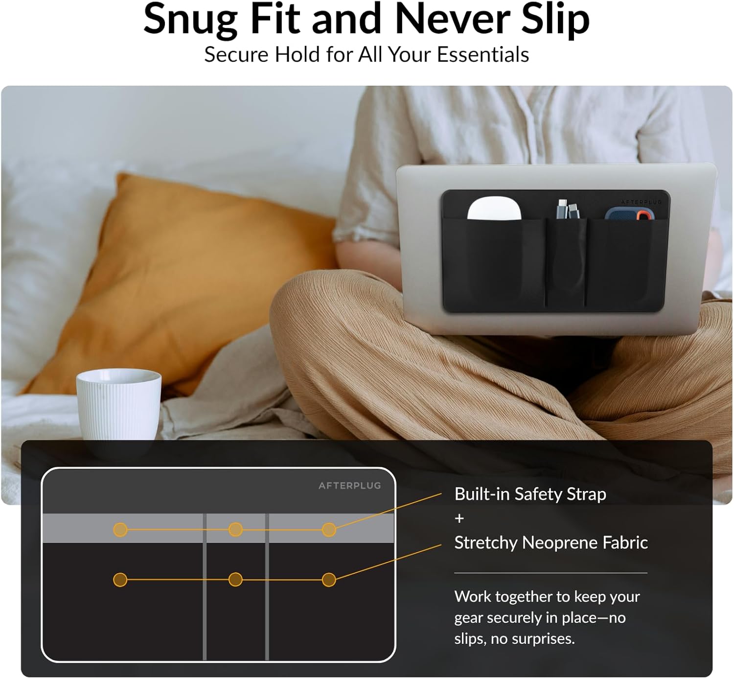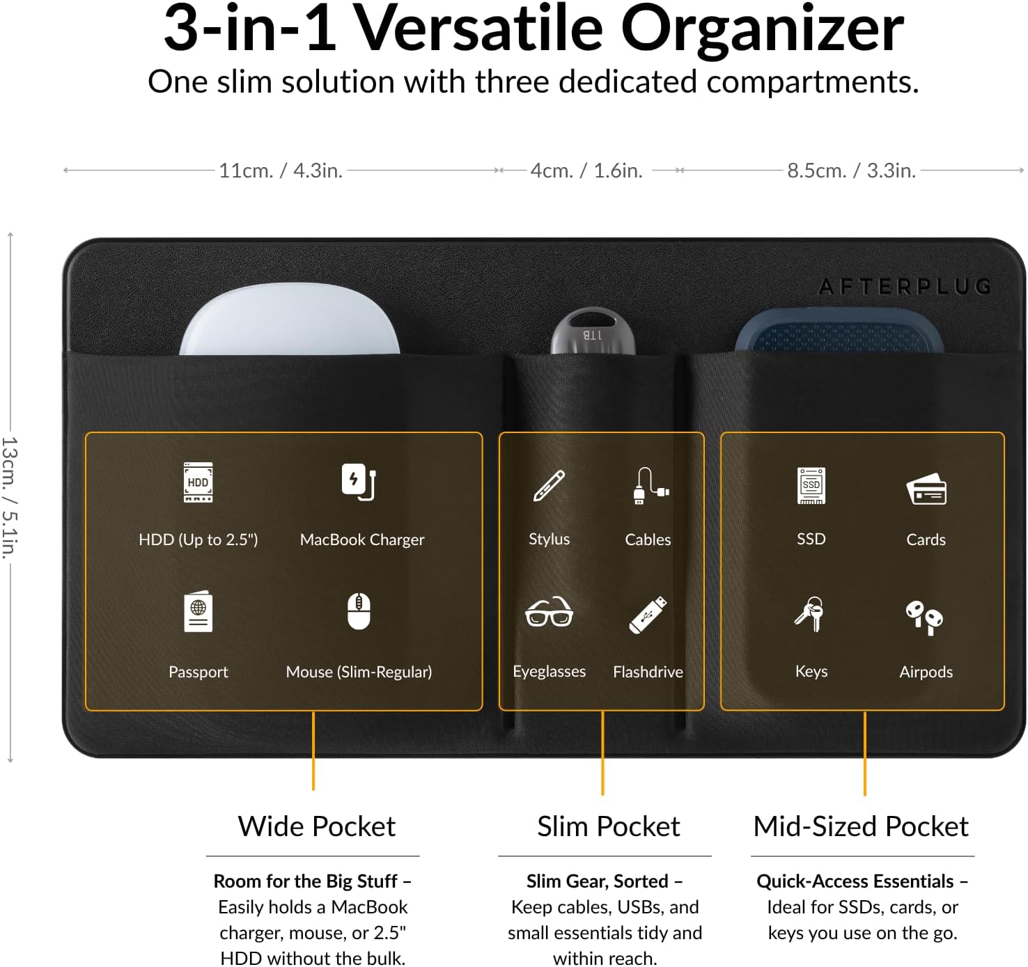 Say goodbye to cluttered workspaces with the Afterplug 3-Pocket Storage Pouch. This innovative adhesive organizer attaches securely to your laptop’s back, offering three specialized pockets for your HDD, SSD, USB drives, mouse, and cables. The left pocket holds your HDD or mouse, the center keeps USB drives and tangle-free cables, and the right stores your SSD—positioned for quick access near USB ports of your laptop. A built-in strap/rubber band ensures accessories stay secure, while the strong adhesive keeps the pouch in place. Compact and lightweight, it’s perfect for professionals on the go, maintaining an organized workspace at home, the office, or while traveling.