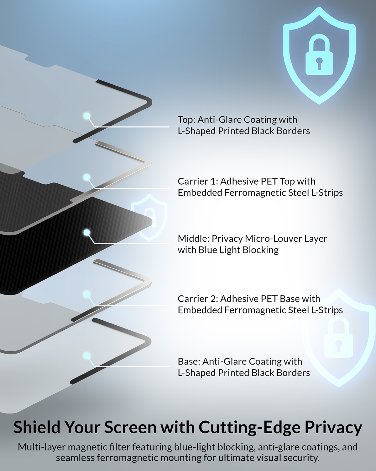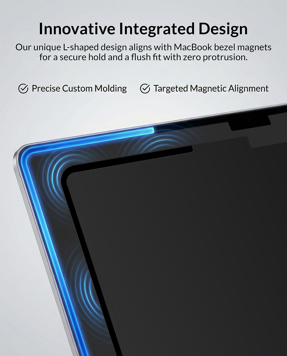 Afterplug Magnetic Privacy Screens are precision-designed exclusively for MacBook. Unlike generic filters, our custom L-shaped magnets align perfectly with your MacBook’s internal magnets for a rock-solid hold that prevents lifting and flapping.