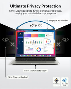 Protect your data with a 30-degree viewing angle that blacks out side views, and reduce eye strain with multi-layer coatings that cut glare and block harmful blue light.