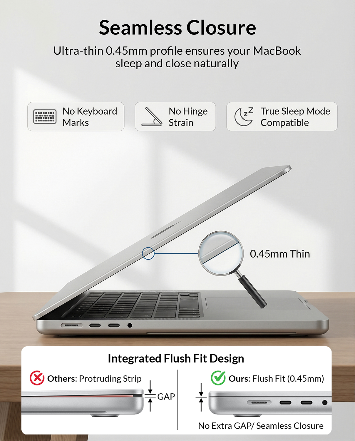 The ultra-flat magnetic strips sit flush with the filter, allowing your lid to close naturally and eliminating pressure marks, hinge strain, and keyboard impressions. The scratch-resistant surface shields against dust and daily wear while maintaining a perfect fit.